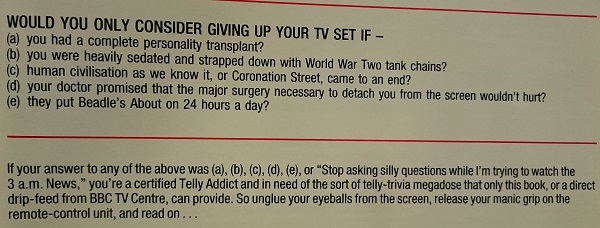 Until recently however, I didn't know there was also a spin-off book released around the same time. In fact I remained clueless until some random Addicts related Googling for clips turned up a copy of the fantastically pompously titled "Telly Addicts Special" for a penny on Abe Books. And now its here, I can "proudly" "present" My Bestest Bits Of The Book Entitled Telly Addicts Special!